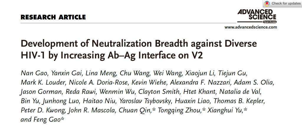 高峰教授、于湘晖教授科研团队针对目前已知报道感染时间最长的恒河猴动物模型作为研究对象,分析其体内诱导产生的广谱中和活性。通过抗体分离获得针对特异表位的J038广谱中和抗体谱系。该工作研究抗体谱系以及体内病毒包膜蛋白的突变情况,追溯广谱中和抗体的进化过程以及与SHIV共同进化的过程,分析非人类灵长动物体内与人体内产生广谱中和抗体的类似性,为更好地应用恒河猴模型来评价HIV-1疫苗提供理论和实验依据。该J038谱系抗体的发育细节和识别特征为今后V2靶向广谱中和抗体的研究和应用提供了新的见解。该研究成果于2022年03月24日在学术期刊《Advanced Science》在线发表(Development of Neutralization Breadth against Diverse HIV-1 by Increasing Ab–Ag Interface on V2)。论文第一完成单位为博彩App