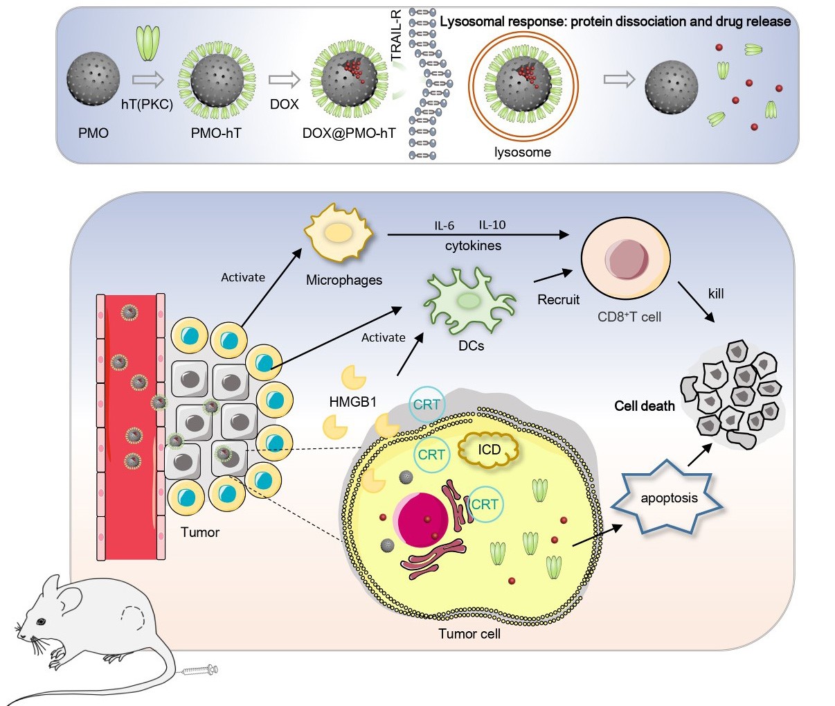 无机合成与制备化学国家重点实验室乔振安教授合作,利用TRAIL修饰的周期性介孔二氧化硅(PMO)作为药物载体携载化疗药物,在小鼠模型上通过静脉给药实现了肿瘤的靶向和协同杀伤作用,并引发了有效的抗肿瘤免疫。研究首次证实TRAIL修饰的PMO能够在体内外诱导肿瘤细胞产生ICD,进而通过激活DCs,提升肿瘤杀伤T细胞的浸润和活性,产生更好的抗肿瘤效果。该研究为设计具有抗肿瘤免疫激活功能的靶向纳米药物提供了新的思路。