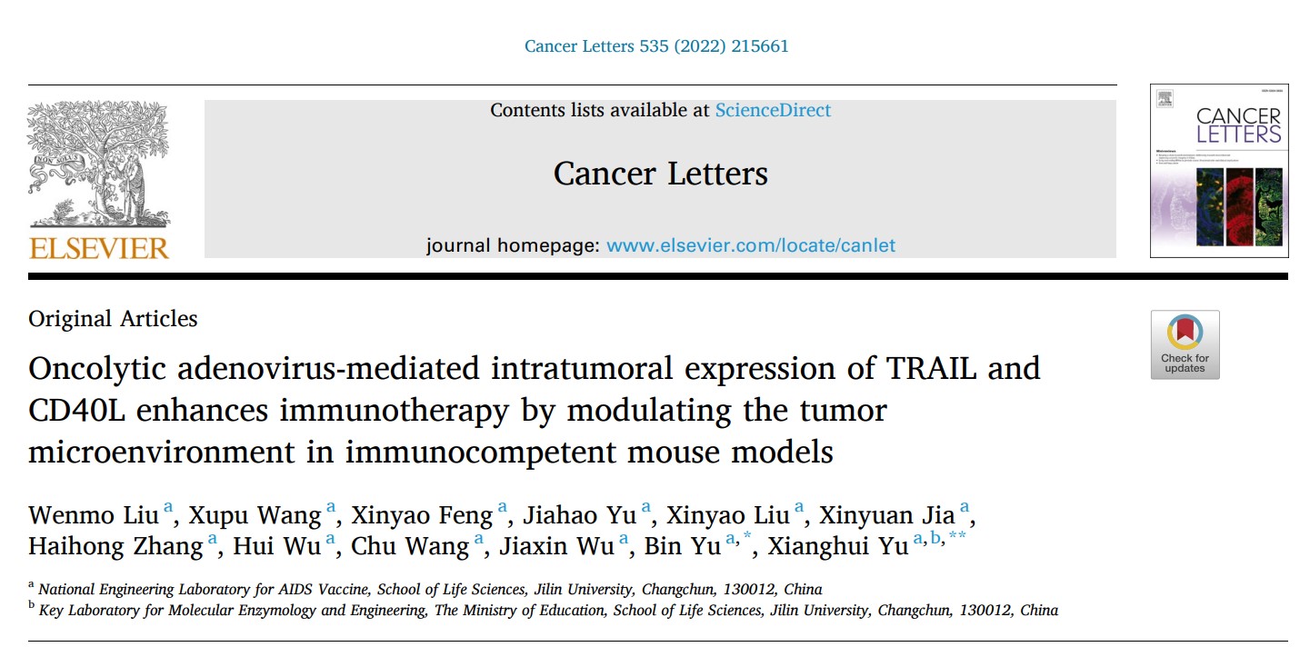 于湘晖教授、于彬教授团队利用前期设计的靶向型溶瘤腺病毒(CRAd5-TRAIL)与表达CD40L的基因治疗载体联用,通过对肿瘤微环境进行免疫调节,增强了抗肿瘤活性,为溶瘤腺病毒介导的实体瘤免疫治疗提供了新策略。研究成果被肿瘤学专业期刊《Cancer Letters》接收,并将于2022年6月1日发表(Oncolytic adenovirus-mediated intratumoral expression of TRAIL and CD40L enhances immunotherapy by modulating the tumor microenvironment in immunocompetent mouse models, 2022,535: 215661, //doi.org/10.1016/ j.canlet.2022.215661)
