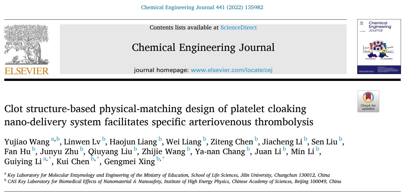 高能物理研究所邢更妹研究员团队合作,通过调整血小板膜伪装递送系统的粒径,优化递送系统在动静脉血栓中的渗透性和滞留性,构建出物理匹配型血栓递送系统,实现了动脉静脉血栓的特异性溶栓治疗。相关研究成果以“Clot structure-based physical-matching design of platelet cloaking nano-delivery system facilitates specific arteriovenous thrombolysis”为题,于2022年8月1日正式发表在Chemical Engineering Journal。