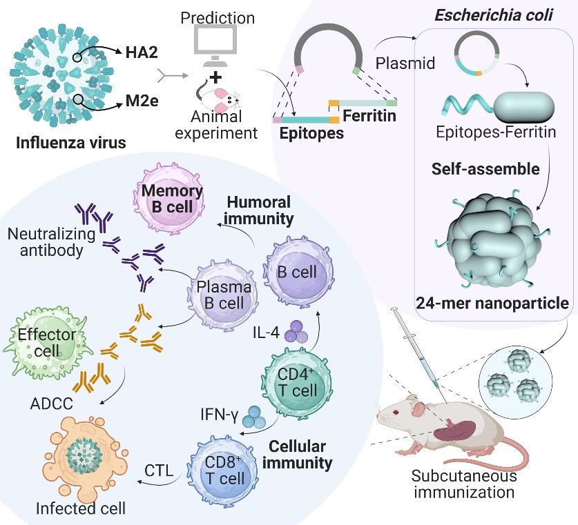 图1:将HA2和M2e的保守线性表位搭载Ferritin纳米平台,开发了一种可激发全面、持久、交叉的免疫应答多表位自组装纳米疫苗。