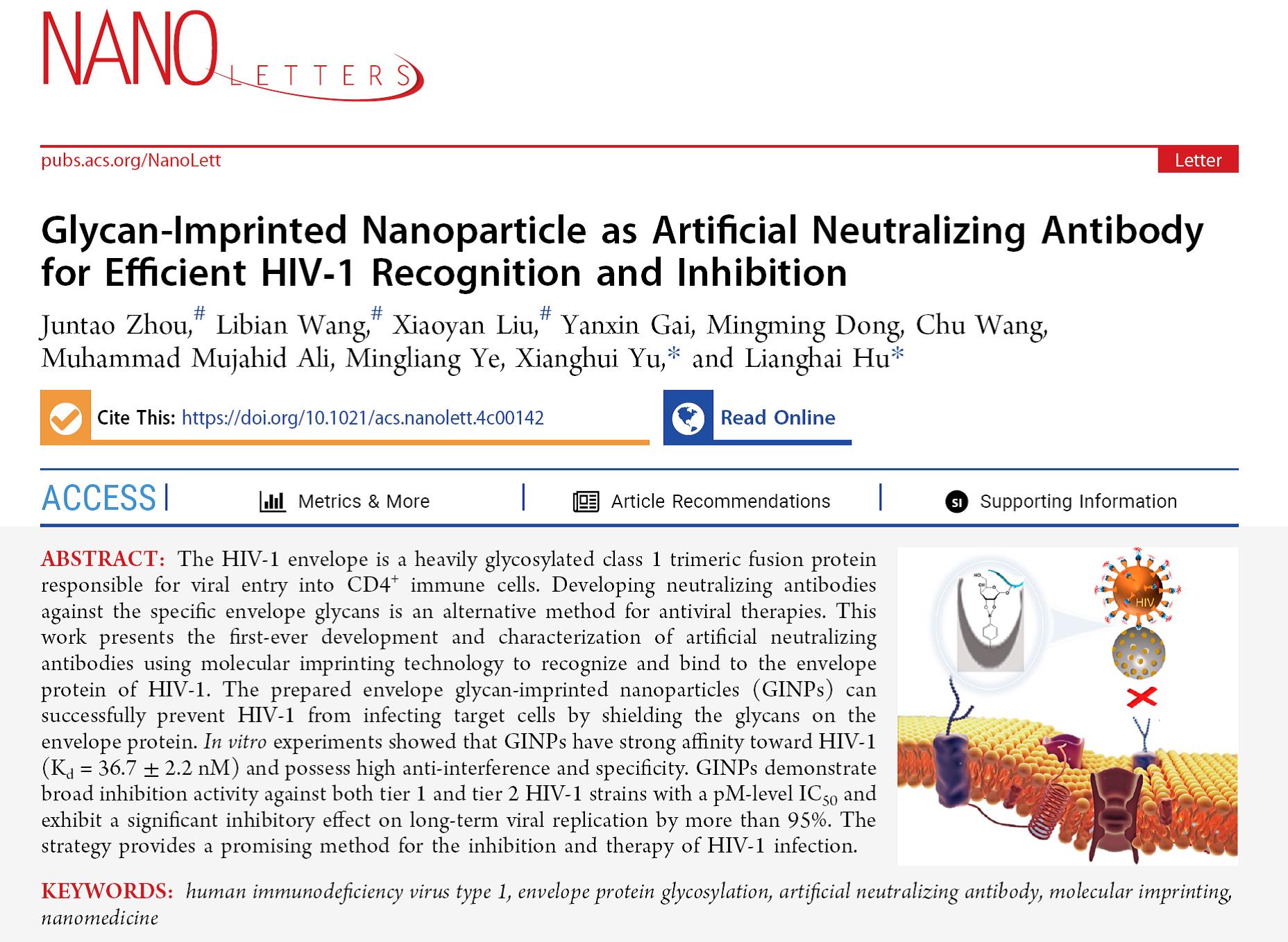 于湘晖教授/胡良海教授团队和中科院大连化物所叶明亮研究员团队合作,开发了针对 HIV-1表面蛋白"糖盾"的分子印迹人工抗体材料,从而有效抑制病毒对细胞的感染,相关研究内容以“Glycan Imprinted Nanoparticle as Artificial Neutralizing Antibody for Efficient HIV-1 Recognition and Inhibition”为题在Nano Letters在线发表。