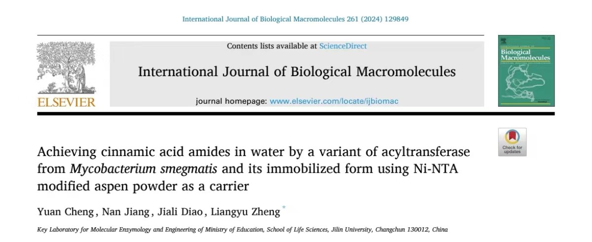 通过虚拟筛选获得的酰基转移酶 MsAcT突变体,具有水相N-酰化反应活性,可以在水相中实现肉桂酸酰胺的高产率制备;以生物质木粉为载体,采用亲和固定化策略,实现了MsAcT突变体的同步纯化与固定化,进一步提高了酶在水相中的N-酰化反应活性,使用稳定性及重复实用性,具有很好的应用前景。该研究论文“Achieving cinnamic acid amides in water by a variant of acyltransferase from Mycobacterium smegmatis and its immobilized form using Ni-NTA modified aspen powder as a carrier”已发表在国际学术期刊《International Journal of Biological Macromolecules》上。论文第一完成单位为博彩App