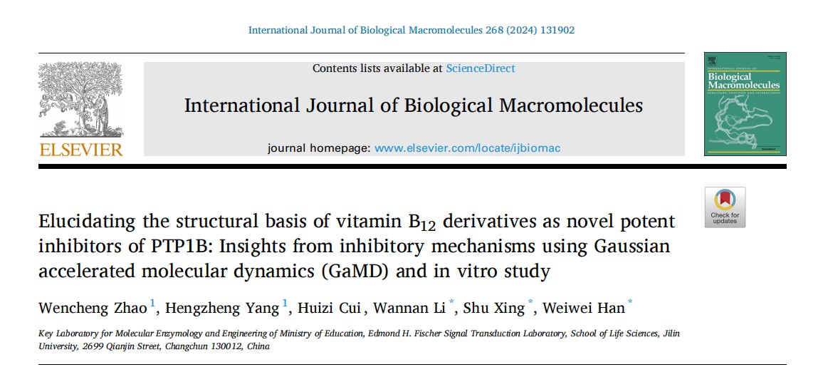 该成果以《Elucidating the Structural Basis of Vitamin B12 Derivatives as Novel Potent Inhibitors of PTP1B: Insights from Inhibitory Mechanisms Using Gaussian accelerated Molecular Dynamics (GaMD) and In Vitro Study》为题,发表在国际期刊International Journal of Biological Macromolecules上。2022级硕士杨恒政和2016级博士赵文珹为共同第一作者,邢述教授、李婉南副教授、韩葳葳教授为共通讯作者。同时该研究得到吉林省科技发展项目(20210101004JC)的资助。