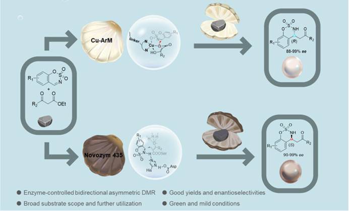 该研究报道了一种酶控双向对映选择性催化策略,用于不对称脱羧曼尼希反应(DMR)合成手性β-磺酰胺酮。研究通过构建铜人工金属酶(Cu-ArM)和利用商业脂肪酶Novozym 435,分别实现对R和S构型产物的高选择性合成。Cu-ArM由生物素化铜复合物与链霉亲和素(WT-Sav)组装而成,催化环状磺酰胺与β-酮酯反应生成R构型产物;而Novozym 435通过其催化三元活性中心调控反应路径,高效获得S构型产物。分子动力学模拟揭示了酶-底物相互作用机制,阐明环状亚胺因稳定氢键网络和紧凑构象而优于非环状底物的原因。该方法在温和水相条件下实现低催化剂负载(Cu-ArM仅0.5 mol%),并成功应用于克级合成及药物分子衍生物制备(如降压抗炎活性分子chroman-4-amine)。该工作为绿色合成手性含氮药物分子提供了新范例,拓展了生物催化在不对称合成中的应用潜力。论文第一完成单位为博彩App