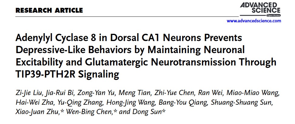 陈文兵教授团队,在抑郁症发病机制研究领域取得重要突破。该研究通过整合行为学、高通量测序、电生理记录及钙信号光纤成像等技术手段,创新性提出背侧海马腺苷酸环化酶8(ADCY8)功能异常是抑郁症发生的关键风险因素,为抑郁症的病理机制阐释和靶向干预提供了全新的理论依据。研究成果于2025年12月12日在国际学术期刊《Advanced Science》上发表。