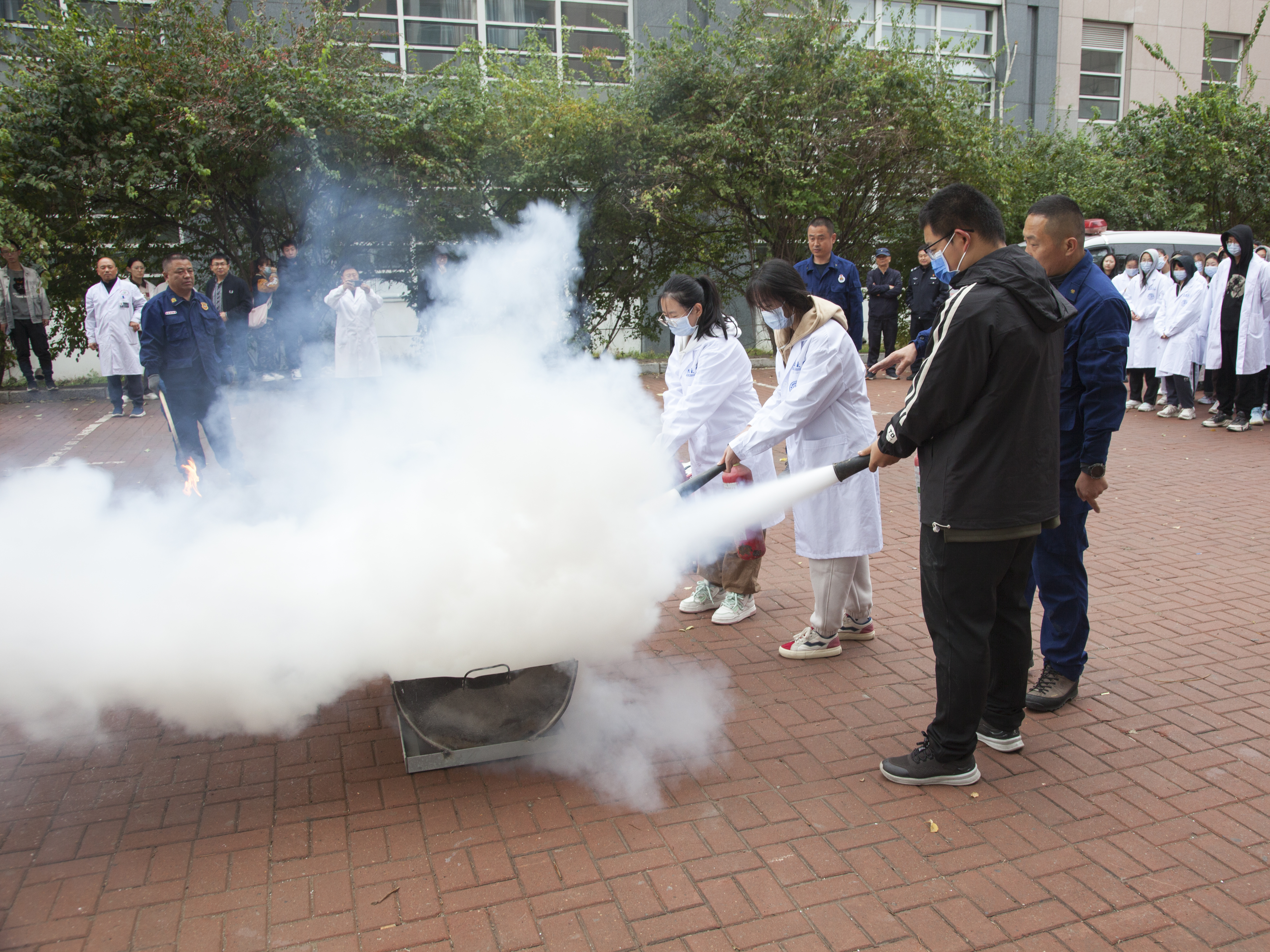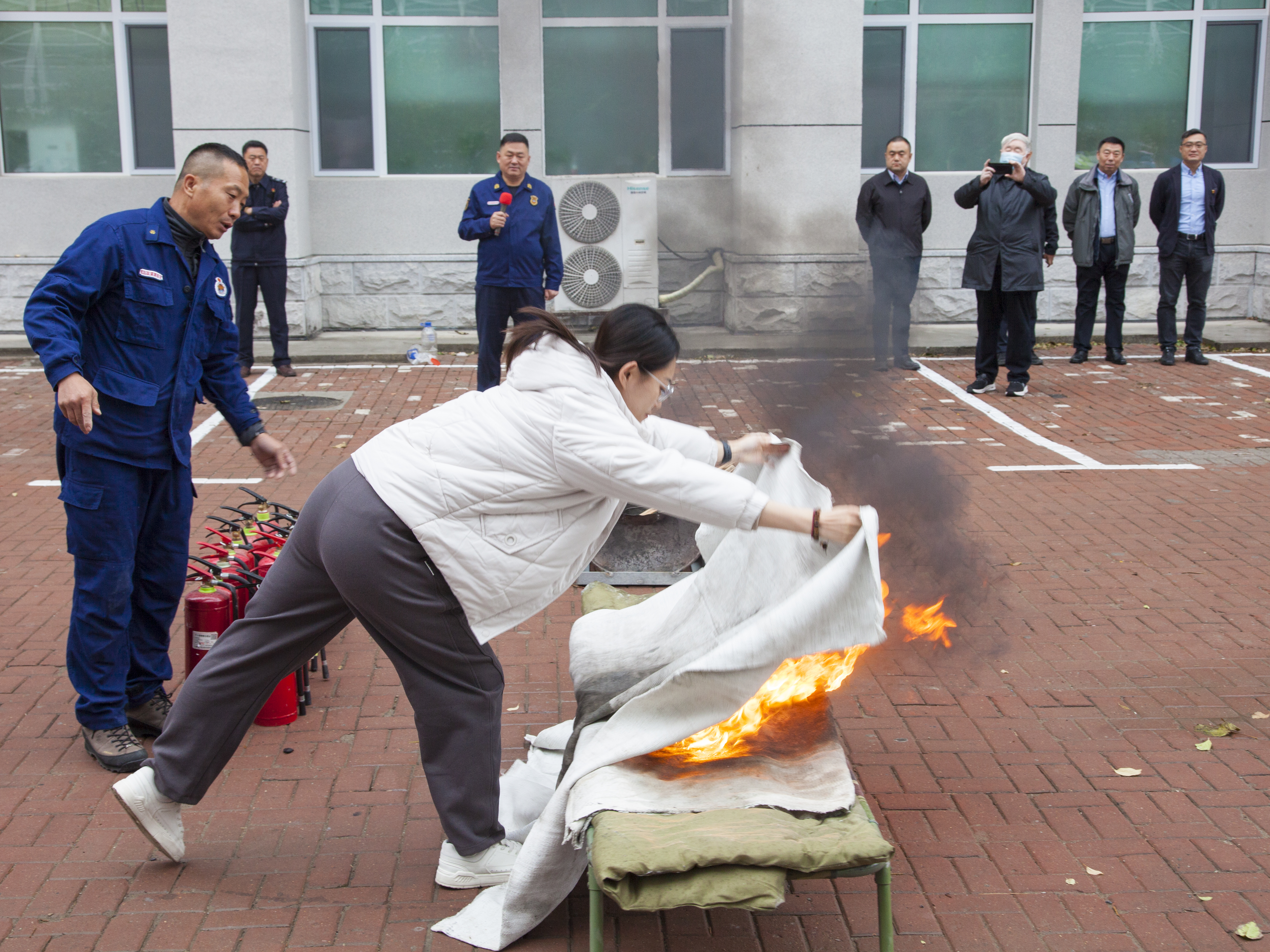 8:30分,“火警信号”发出,各楼层迅速组织师生进行疏散,并按照预案进行火灾报警、人员疏散自救、抢救伤员、扑救初级火灾,全体师生在应急疏散中积极配合,听从指挥;各岗位人员各司其职、各尽其责、分工明确、有序地完成了疏散活动。在灭火演练过程中,董立明详细介绍了各种类型灭火器和灭火毯的使用方法及注意事项,参与师生均能够遵守操作规程正确实施演练活动。