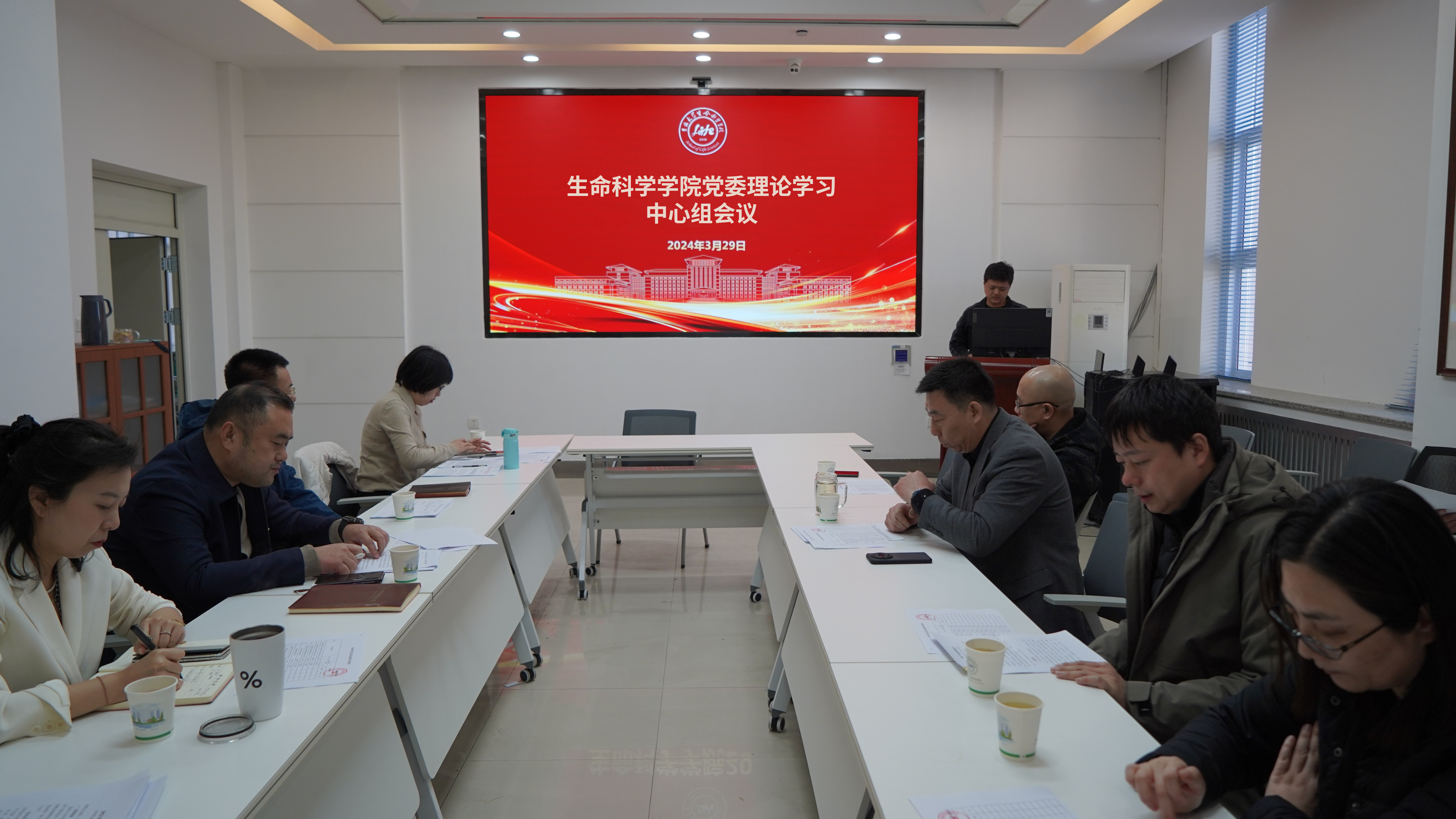 于生命科学楼335会议室召开党委理论学习中心组学习会议。会议由党委书记白宇主持,党委理论学习中心组全体成员参加会议,党建工作联络员王德国列席会议。