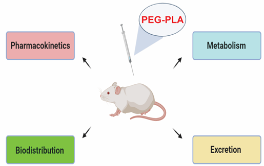 顾景凯教授团队以上市聚合物胶束纳米制剂Genexol-PM的载体材料聚乙二醇-聚乳酸(PEG-PLA)为研究对象,建立了基于液相色谱-串联质谱技术的体内PEG-PLA定量分析方法,在此基础上,研究了PEG-PLA在大鼠体内的分布、代谢、排泄等体内过程(图1)。