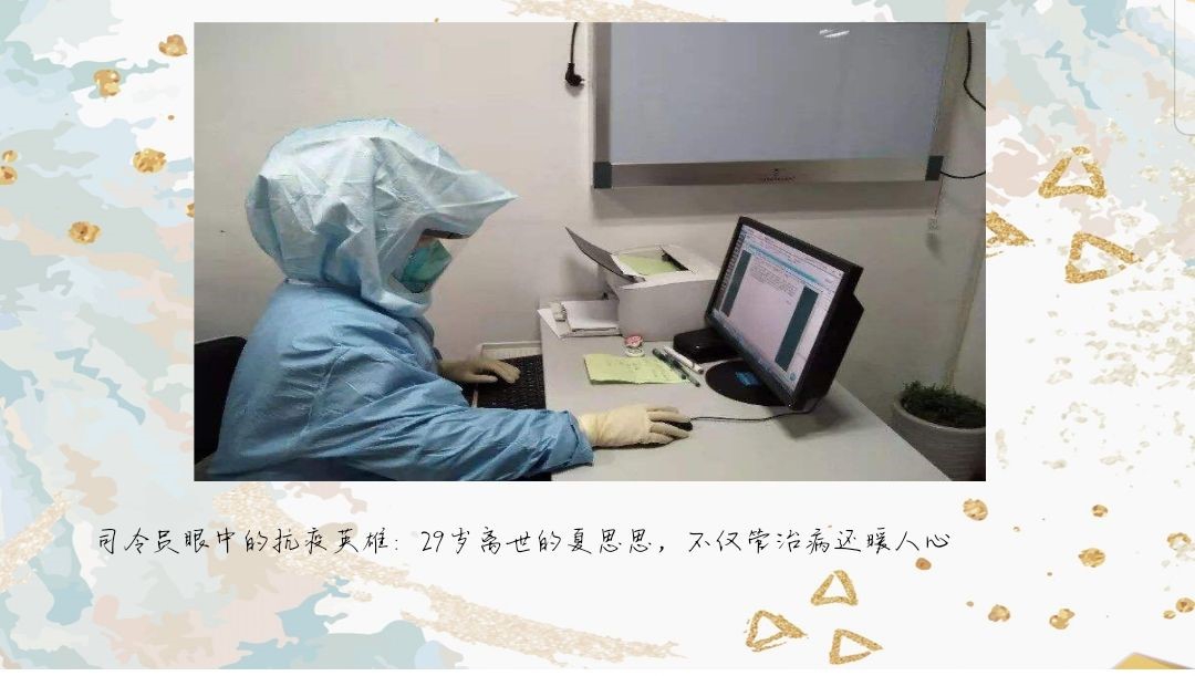 班长介绍了抗疫英雄夏思思,她今年29岁,是消化内科的医生,待病人从来都如亲人一般,在疫情中,她奋战在疫情一线,却不幸感染新冠肺炎,经多方救治却无力回天,于2月23日去世。病人们都说她不仅管治病还暖人心,她值得我们尊敬和学习。