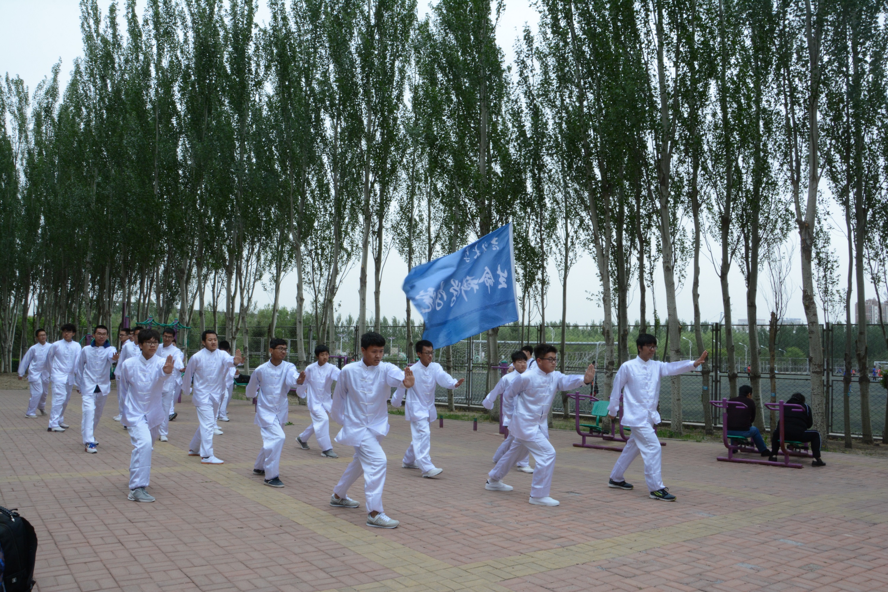 选拔30名男同学组成长拳队伍,由高年级学生全程组织和指导训练。