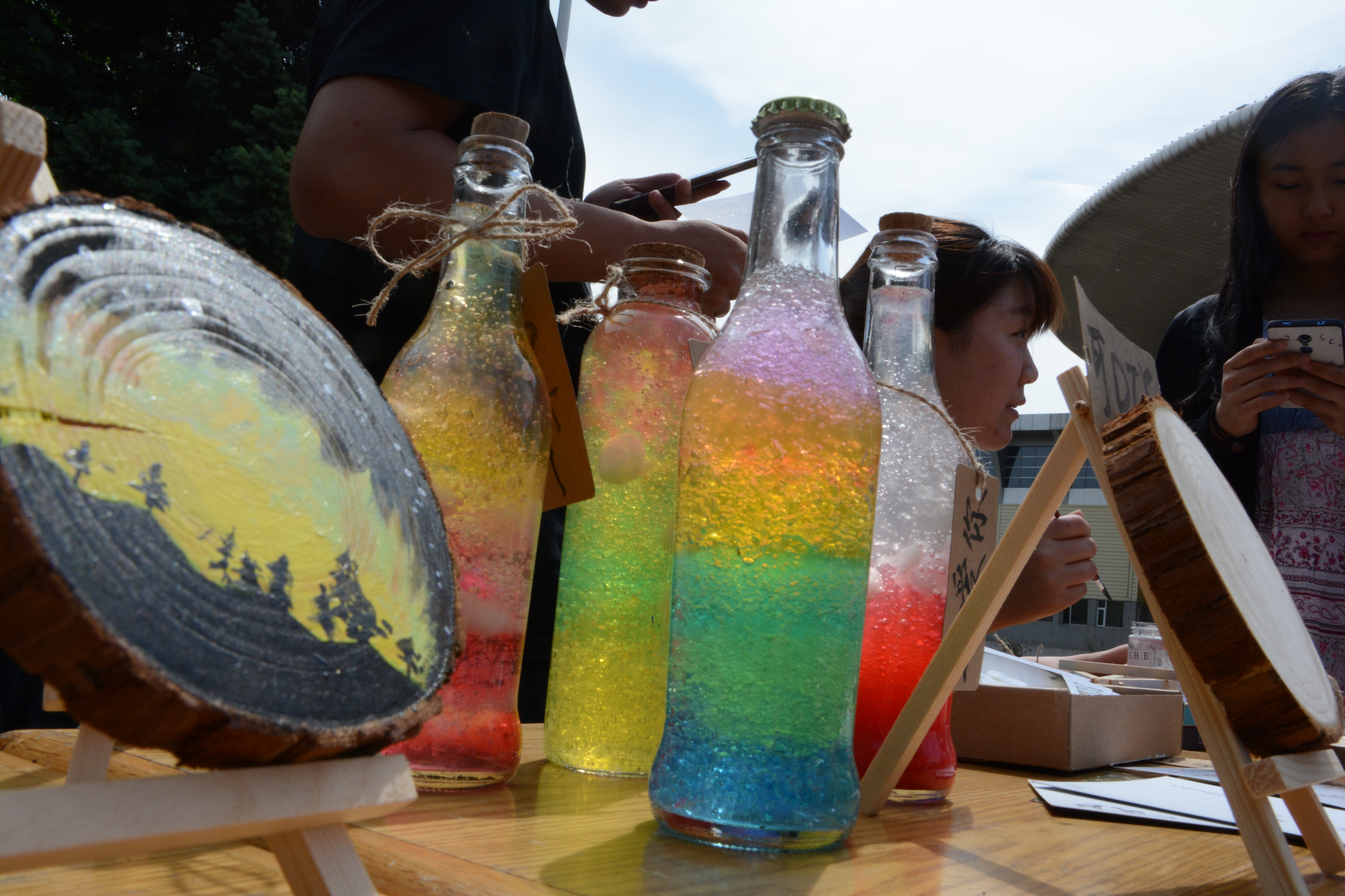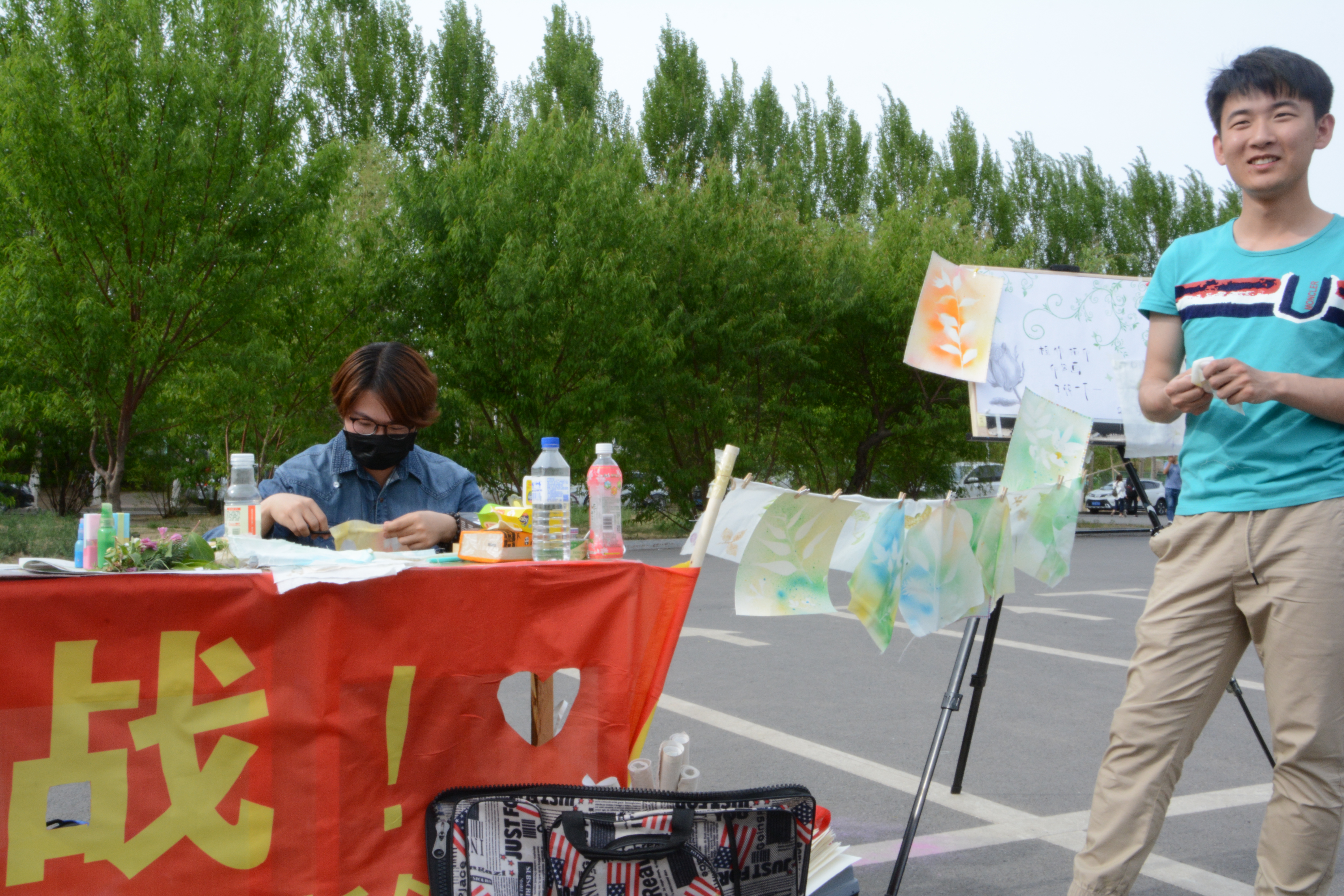 活动前期,各组人员根据100元启动资金,设计准备产品,完成生产与包装,并通过多种渠道广泛宣传,为接下来的销售做好准备。活动于2018年5月19日和20日在新食堂和体育馆门前正式开展。当日,各组成员将各自精心制作的产品供校园中来往的行人挑选。别出心裁的植物印染吸引了一群热爱创作的同学,用五颜六色的颜料挥洒出属于自己的作品;颜值与实用价值并存的手工香皂获得了广大女同学的一致好评;生科秘制配方的驱蚊香囊、充满奇幻色彩的星空瓶、具有纪念价值的明信片和吉大手环等都无比吸引眼球。比赛总有输赢,评选总有优劣,在很多组的商品热销的同时,也有小组的商品无人问津,但可贵的是同学们不放弃的精神,即使处于劣势,也竭尽全力想方设法拓展销路。