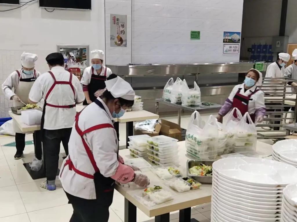 在的莘子园二楼食堂,我看到了工作人员紧锣密鼓的准备早餐盒饭。“孩子们,咱大伙帮帮忙,先把餐装好。”在食堂阿姨的安排下,我们迅速走上了工作岗位,形成了一套流水线作业方式。有人盛饭,有人打菜,有人扣餐盒盖,有人装袋包装。三四条流水线一起开动,很快就完成了2600份早餐的分装。