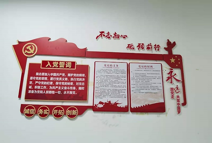 “党员学习园地”主要包括展示墙和学习角两个部分,展示墙部分主要呈现了入党誓词、党员义务和权利内容,学习角部分有《习近平谈治国理政》第一二、三卷、《新时代、新思想、新征程》、《习近平新时代中国特色社会主义思想学习纲要》、《爱之深 爱之切》、《中国共产党的九十年》、《习近平总书记系列重要讲话读本》等学习书籍和资料,供大家借阅和交流。