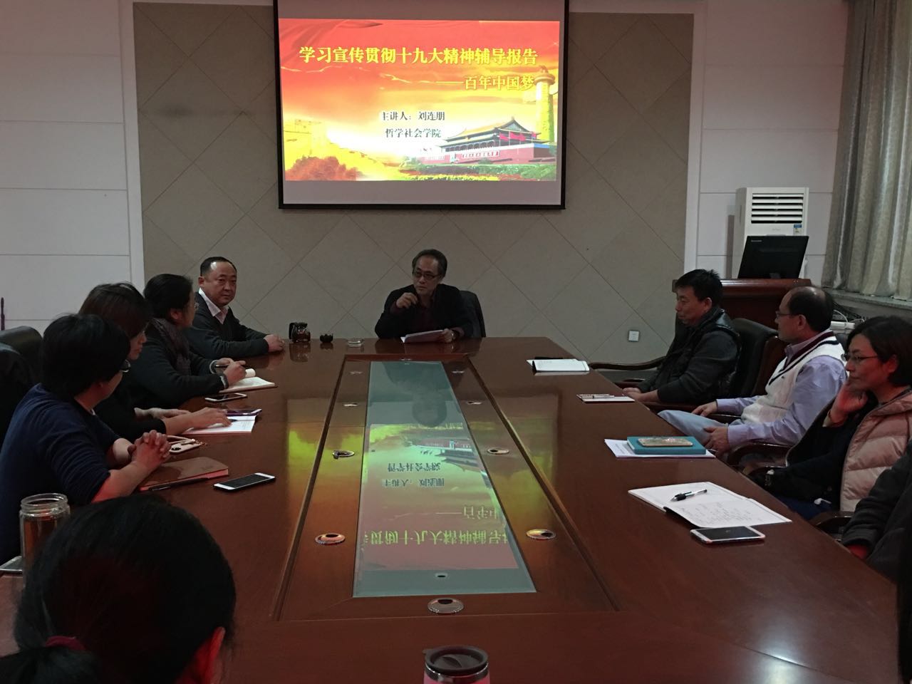 刘连朋老师在辅导报告中以中国传统文化为背景,在介绍康有为、严复等现代思想基础上,对照孙中山、戴季陶等国民党人民生思想,从中国百年历史进程、民族复兴的历史进程入手,解释社会主义来华的最初状态、最早宣传社会主义的人和为什么在中国宣传社会主义,并详细解读三个专题内容即“毛泽东思想引领中国站起来”、“邓小平理论引领中国富起来”、“习近平新时代中国特色社会主义思想引领中国强起来”。他强调,从个人理论研究角度看,十九大报告提出的“中国共产党人的初心和使命,就是为中国人民谋幸福,为中华民族谋复兴。”的科学论断是实现革命前辈未竟事业的伟大努力,是对中华民族伟大复兴的超越性使命自觉,是对中国道路的思想自觉,是中国国家理念的具有明证性的理性自觉。“大道之行,天下为公。” 社会主义与传统大同理想相结合,将推进当代世界的一场伟大的社会革命。习近平新时代中国特色社会主义思想是全党全国人民为实现中华民族伟大复兴而奋斗的行动指南,必须长期坚持并不断发展,必将引领中华民族走向伟大复兴、实现人民对美好生活的向往!