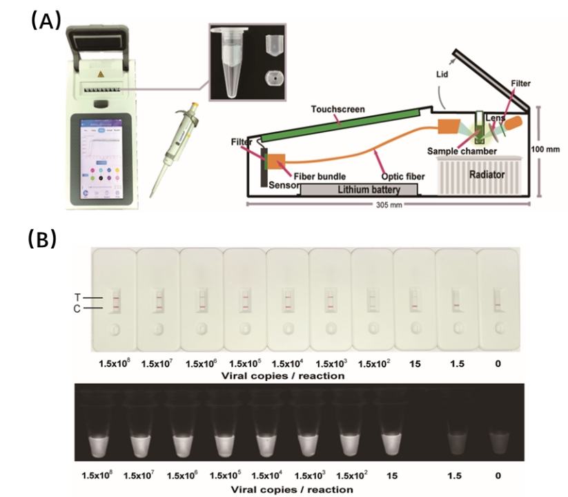 图3. MULAN技术与便携式检测设备(A)、检测试纸及蓝光照射(B)结合