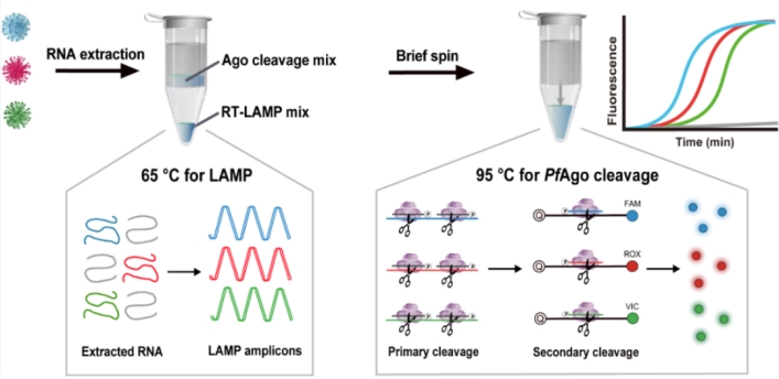 冯雁教授团队探索了高温微生物Pyrococcus furiosus Argonaute 核酸酶(PfAgo)对DNA的催化作用,发现其次级剪切机制,以及对单碱基差异靶标序列精准识别的规律。该工作中,作者建立了Ago-环介导等温扩增(loop-mediated isothermal amplification, LAMP)偶联的多重核酸检测平台技术。其原理是,首先65 oC对病毒核酸样本进行快速等温扩增,然后与高温Ago剪切体系混合,巧妙利用剪切产物DNA介导荧光标记DNA分子的次级剪切,产生相关病毒的荧光报告信号(图1)。研究表明Ago精准剪切作用有效地解决了LAMP非特异扩增造成的假阳性问题。以新冠病毒、甲型流感病毒和乙型流感病毒为检测对象,通过设计3组不同的特异性短链guide DNA与探针,建立多重检测体系,实现了单酶对多重病毒核酸产物的精准识别,临床样本阳性符合率达到100%。