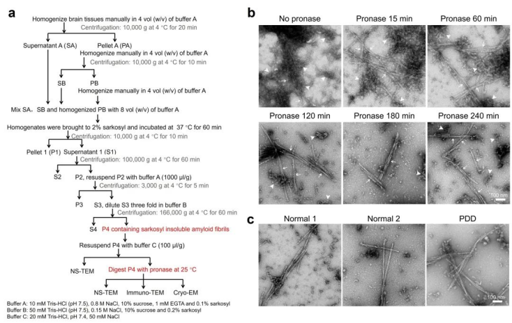 图1. 人脑组织蛋白纤维聚集体提取方法及结果。