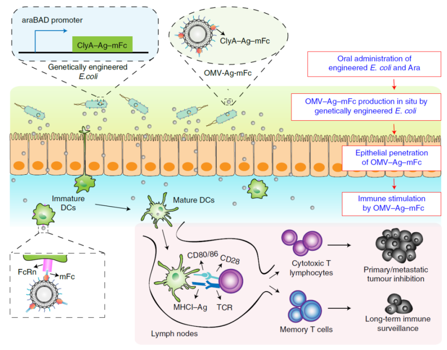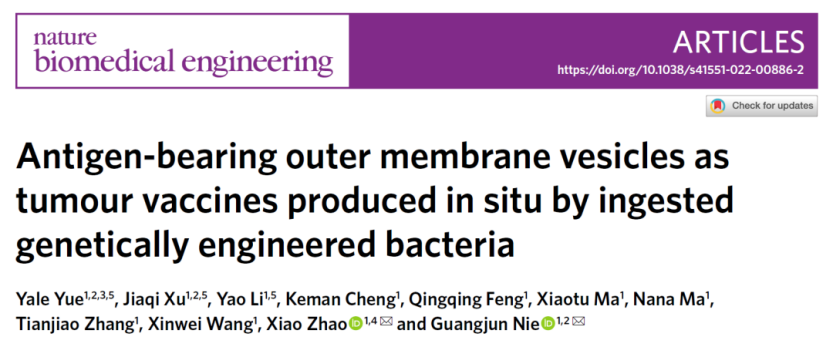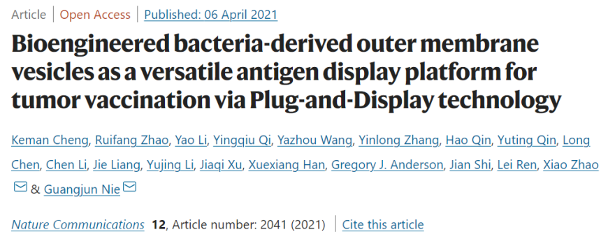 杰出校友、国家纳米科学中心聂广军团队在Nature Biomedical Engineering期刊发表论文【1】,通过对大肠杆菌进行基因工程改造,开发了一种基因工程菌来源的基于外膜囊泡(Outer Membrane Vesicles,OMV)的口服肿瘤疫苗。实现口服有效激活肿瘤抗原特异性免疫反应,发挥抗癌作用。