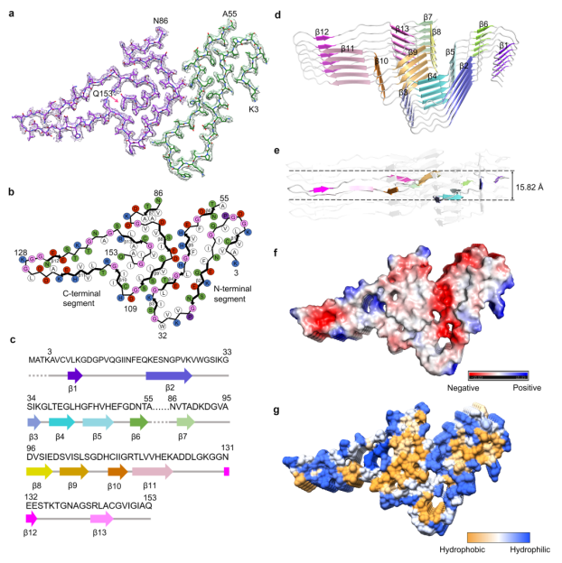 通过比较脱辅基SOD1二聚体结构,研究团队提出,在SOD1错误折叠过程中,脱辅基SOD1亚基的一个α-螺旋和由8个β-折叠组成的β-桶状结构转变成SOD1纤维的13个β-折叠结构。