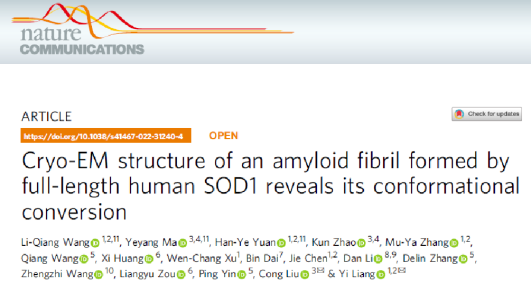 校友刘聪团队(中科院上海有机化学研究所生物与化学交叉中心)与武汉大学梁毅团队在Nature Communications上在线发表了题为Cryo-EM structure of an amyloid fibril formed by full-length human SOD1 reveals its conformational conversion的长文(Article)。该研究全球首先解析铜锌超氧化物歧化酶(SOD1)纤维的高分辨率冷冻电镜结构,揭示了渐冻人症(ALS)致病蛋白质SOD1构象转化分子机制,为发展新的基于SOD1纤维结构的ALS治疗药物奠定了基础。