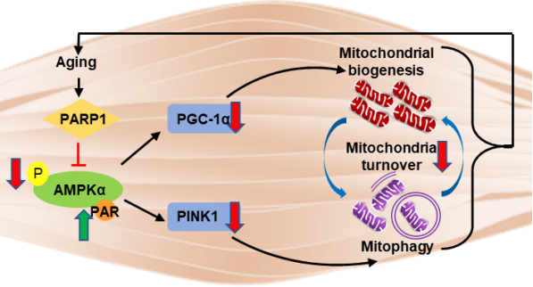 机制研究表明,骨骼肌特异性敲低PARP1上调PGC-1α的表达而使线粒体生成增加,同时上调PINK1表达而促进了线粒体自噬对破损线粒体的清除。本研究首次解释了DNA损伤修复基因Parp1的抑制对能量代谢关键分子AMPKα的精确调控,通过增加线粒体生成和控制线粒体质量,完成骨骼肌中线粒体的高效周转,从而增强骨骼肌代谢功能,实现寿命的延长,提示PARP1抑制除了在癌症肿瘤方面起作用,对延缓衰老也有益处。