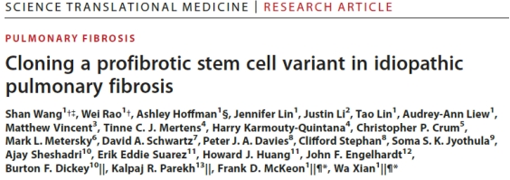 附属口腔医院百人计划研究员王杉等人在Science Translational Medicine发表了最新研究:Cloning a profibrotic stem cell variant in idiopathic pulmonary fibrosis。研究鉴定了在特发性肺纤维化进程中关键的促纤维化干细胞,并针对其开发靶向特异性治疗药物。