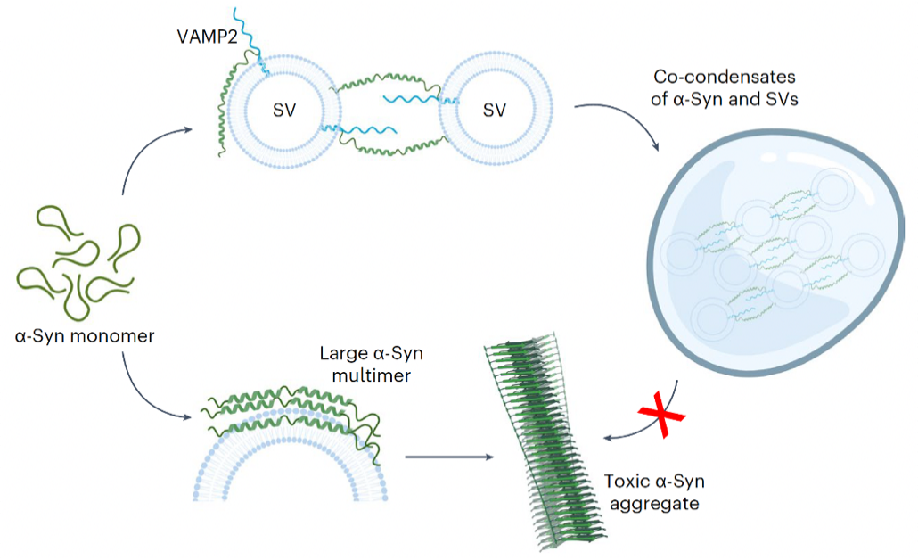 α-突触核蛋白(α-Syn)是一种内在无序蛋白,在神经末梢突触前体中高度表达,其病理性聚集体是帕金森病的关键病理标志物,并与疾病的发生发展密切相关。在生理状态下,α-Syn 可通过突触小泡相关蛋白2(VAMP2)促进神经突触小泡(SV)集群和调节可溶性 N-乙基马来酰亚胺敏感因子附着蛋白受体复合体(SNARE complex)的组装【1】。然而,其生理状态构象及其与SV和其他相关蛋白互作的分子机制尚不明确;另外,α-Syn生理功能是否及如何影响其病理聚集未知。