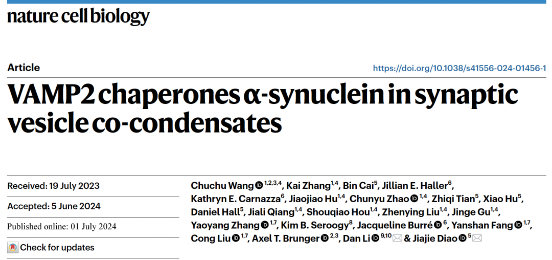刁佳杰课题组在Nature Cell Biology上在线发表题为VAMP2 chaperones α-synuclein in synaptic vesicle co-condensates的研究成果,首次报道了α-syn、VAMP2和SV在体外和神经元中的共相分离现象。