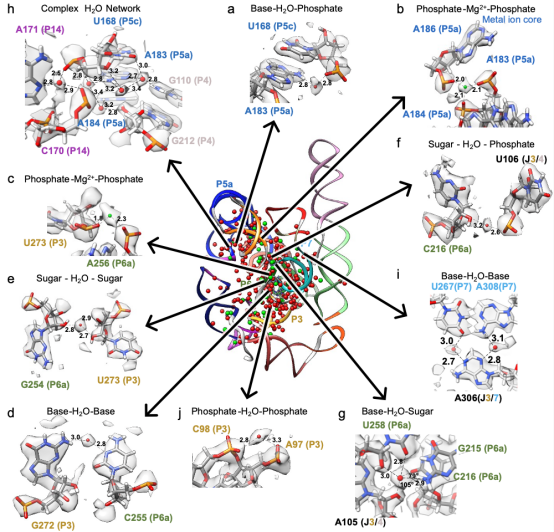 1)首次直接观察到RNA核心区域的水分子网络,并揭示水分子如何在RNA的非经典相互作用中发挥桥接作用。